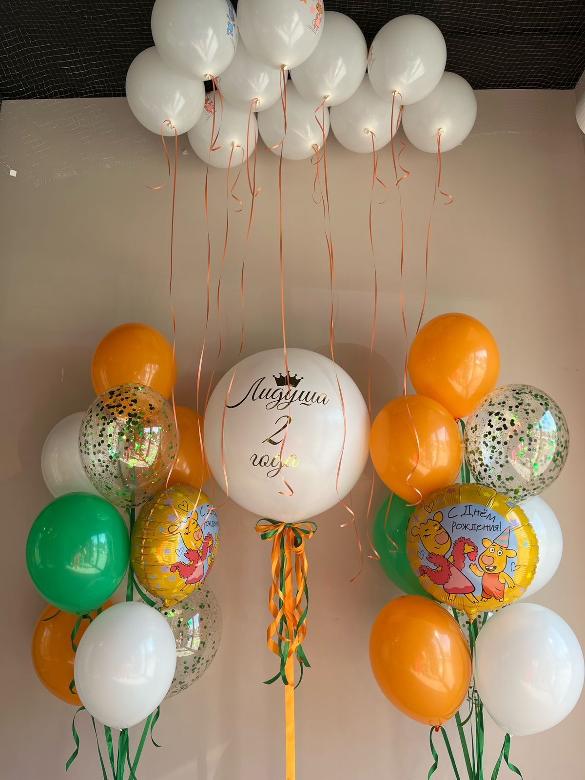 2 фонтана по: 7 однотонных, 2 с конфетти, круг "оранжевая корова"