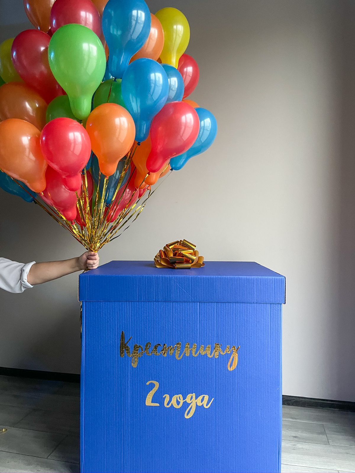 Коробка с надписью и бантом и 80 разноцветных шариков на дождике