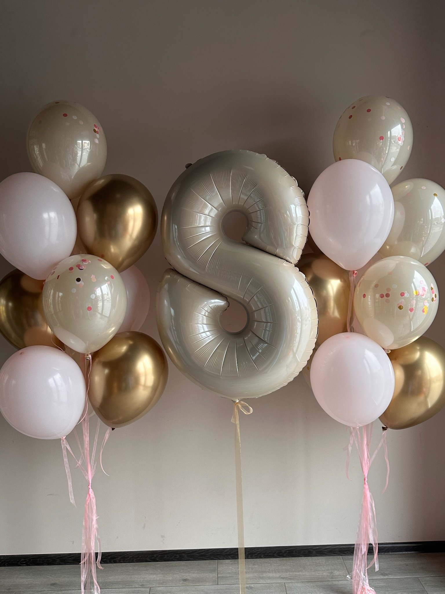 2 фонтана по 10 шаров (3 хром, 2 дабл-стаф, 5 обычных) на атласных лентах