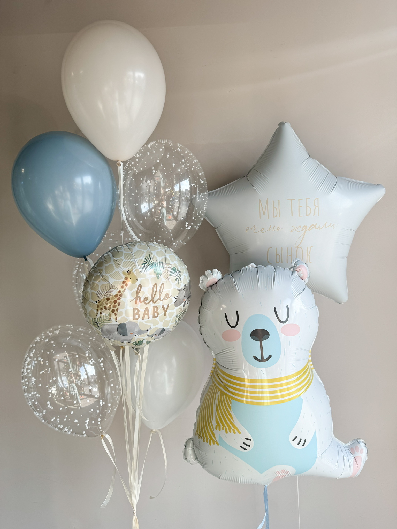 Фонтан из 7 шаров (1 крем, 1 белый, 1 ретро голубой, 3 прозрачных с конфетти, круг)