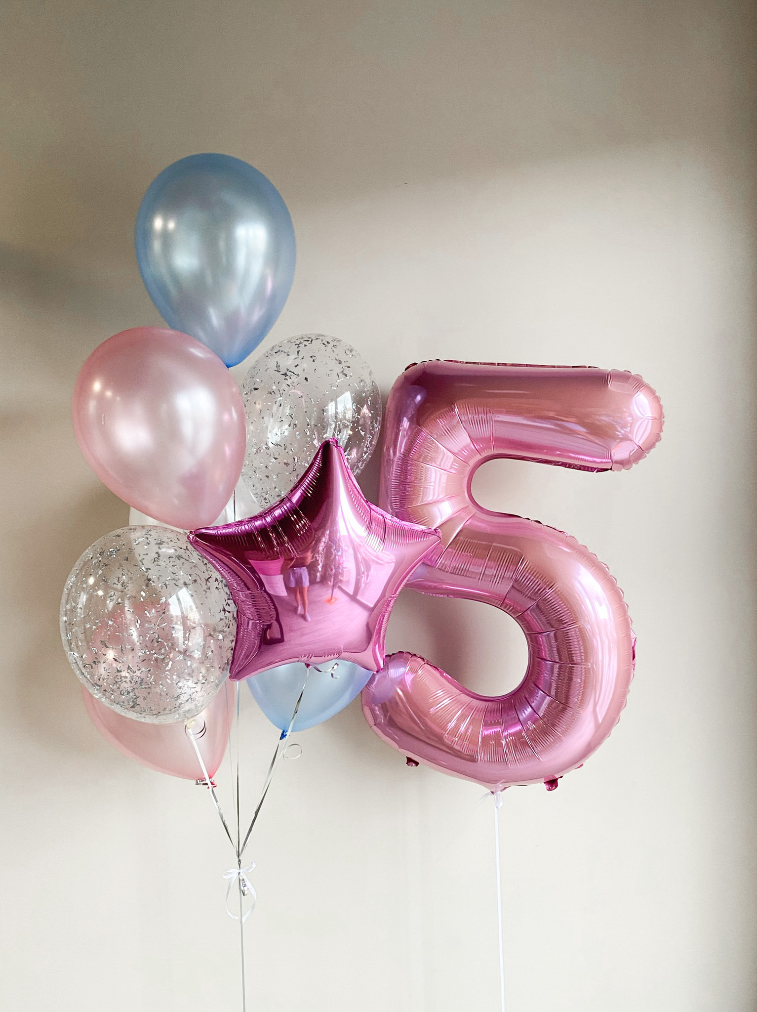 - Фонтан из 8 шаров: звезда, 2 с конфетти и 5 однотонных.
