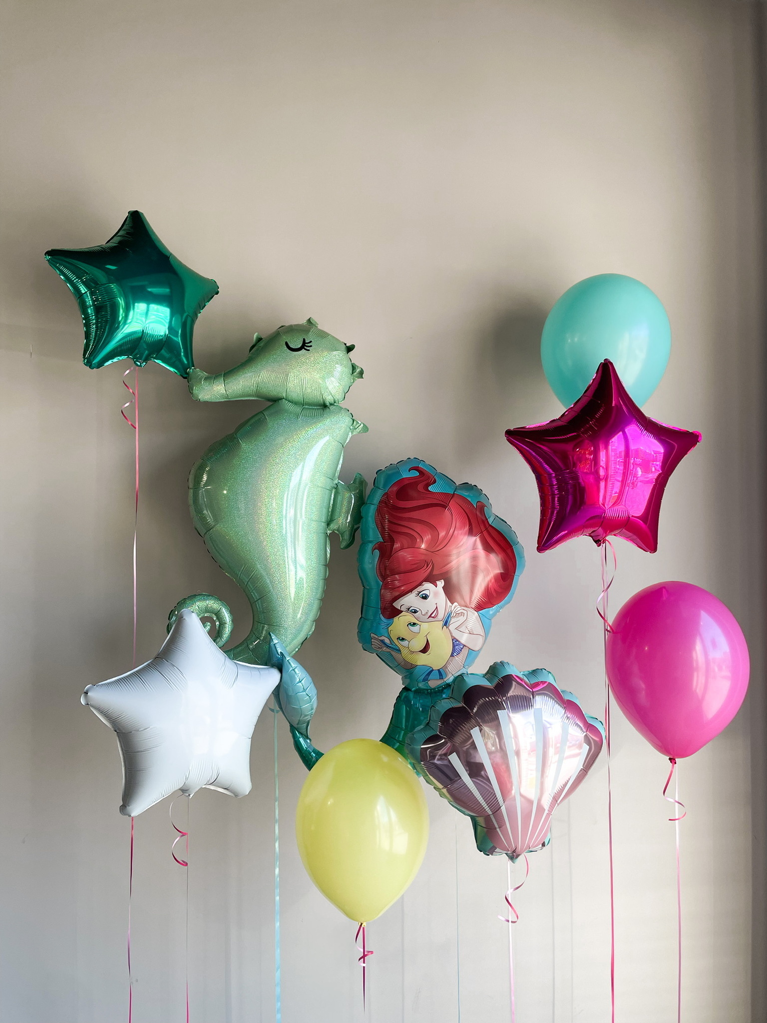Состав композиции: - Фигурка Русалочка - Фигурка Морской конек - Фигурка Ракушка - 3 звезды - 3 однотонных шара