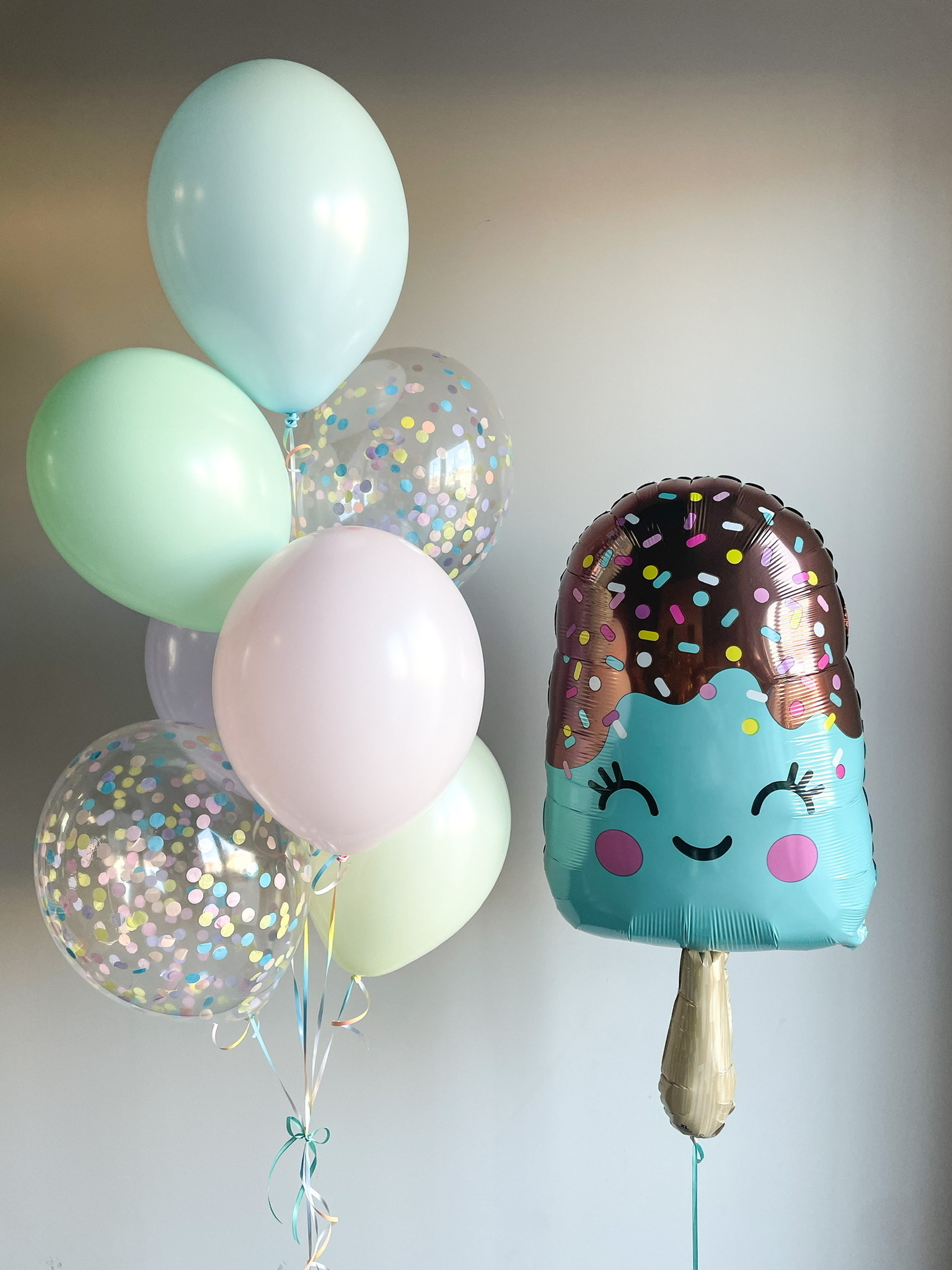 - Фонтан из 7 шаров: 2 с конфетти 2 однотонных.