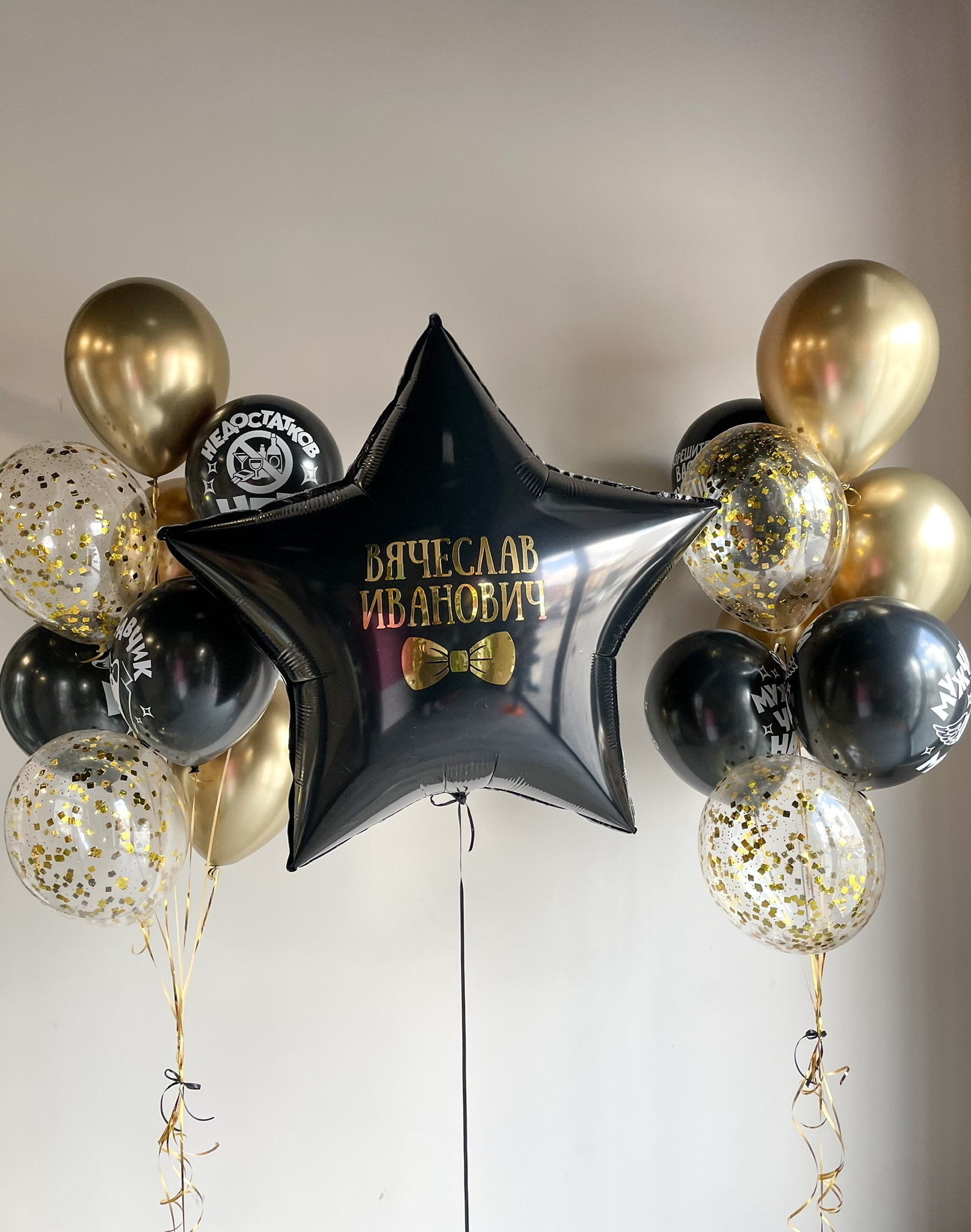- Два Фонтана из 9 шаров: 3 с конфетти, 3 хром и 3 с рисунком