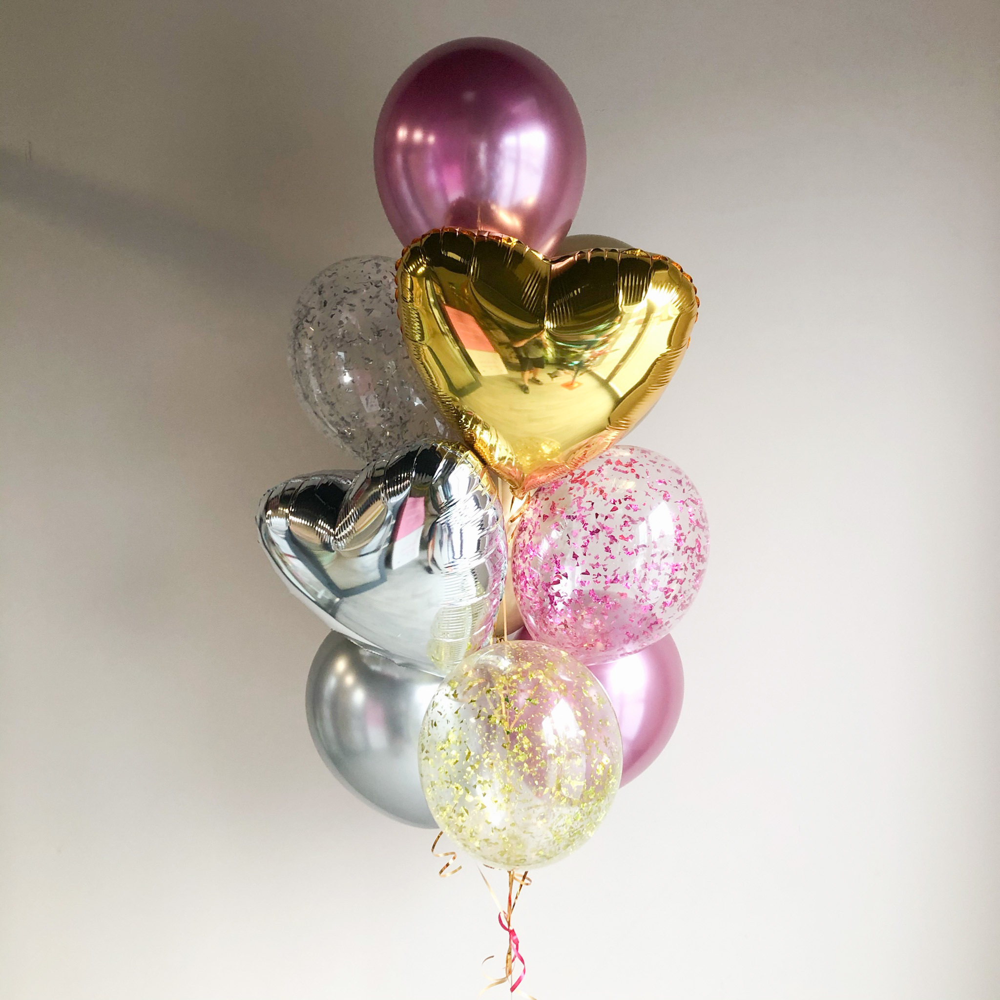 - Фонтан из 10 шаров: 2 сердца, 3 с конфетти и 5 хром