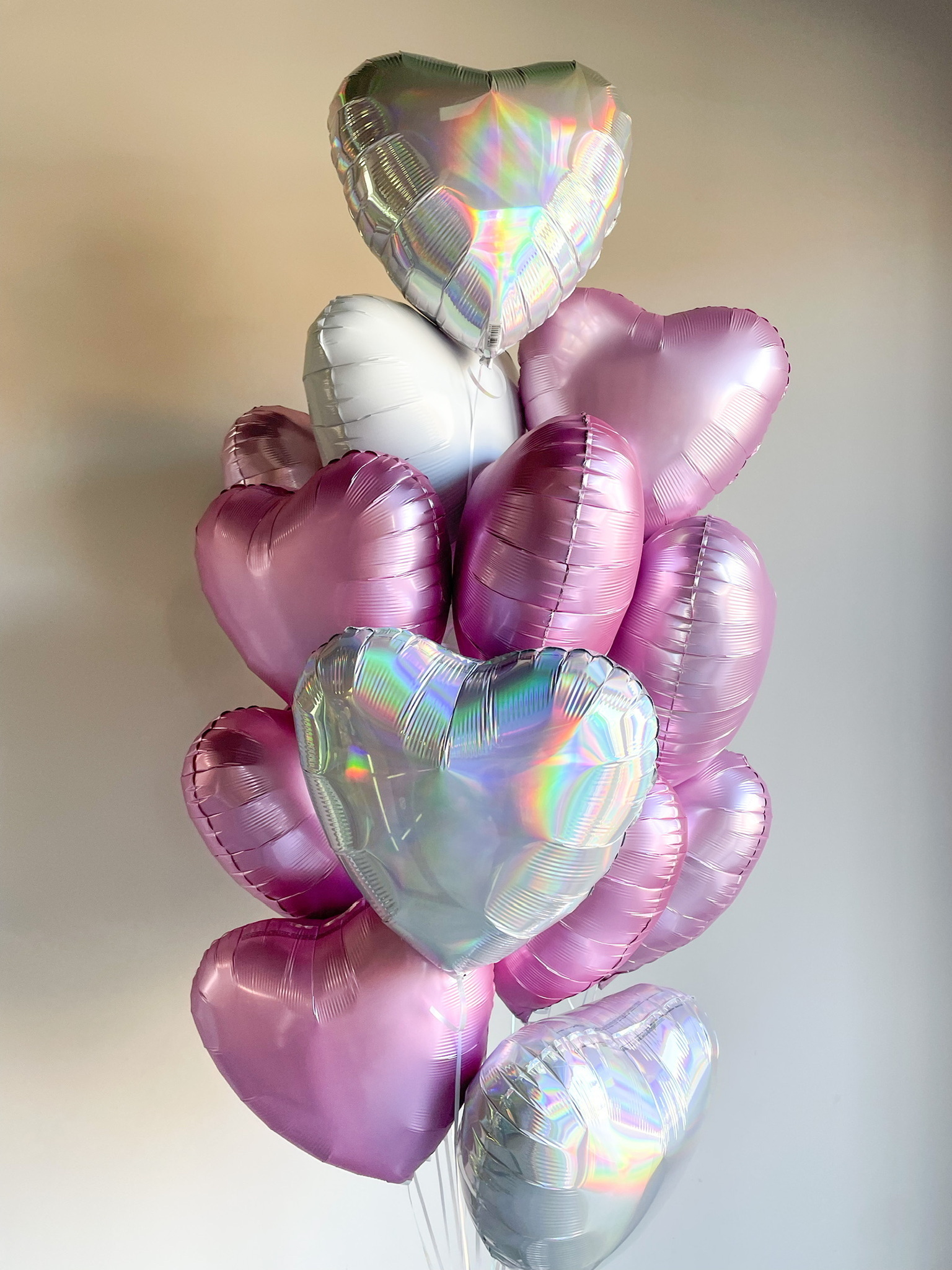 • Фонтан из 15 сердец (3 сердца голография, 5 белых, 2 розовый градиент, 5 розовых)