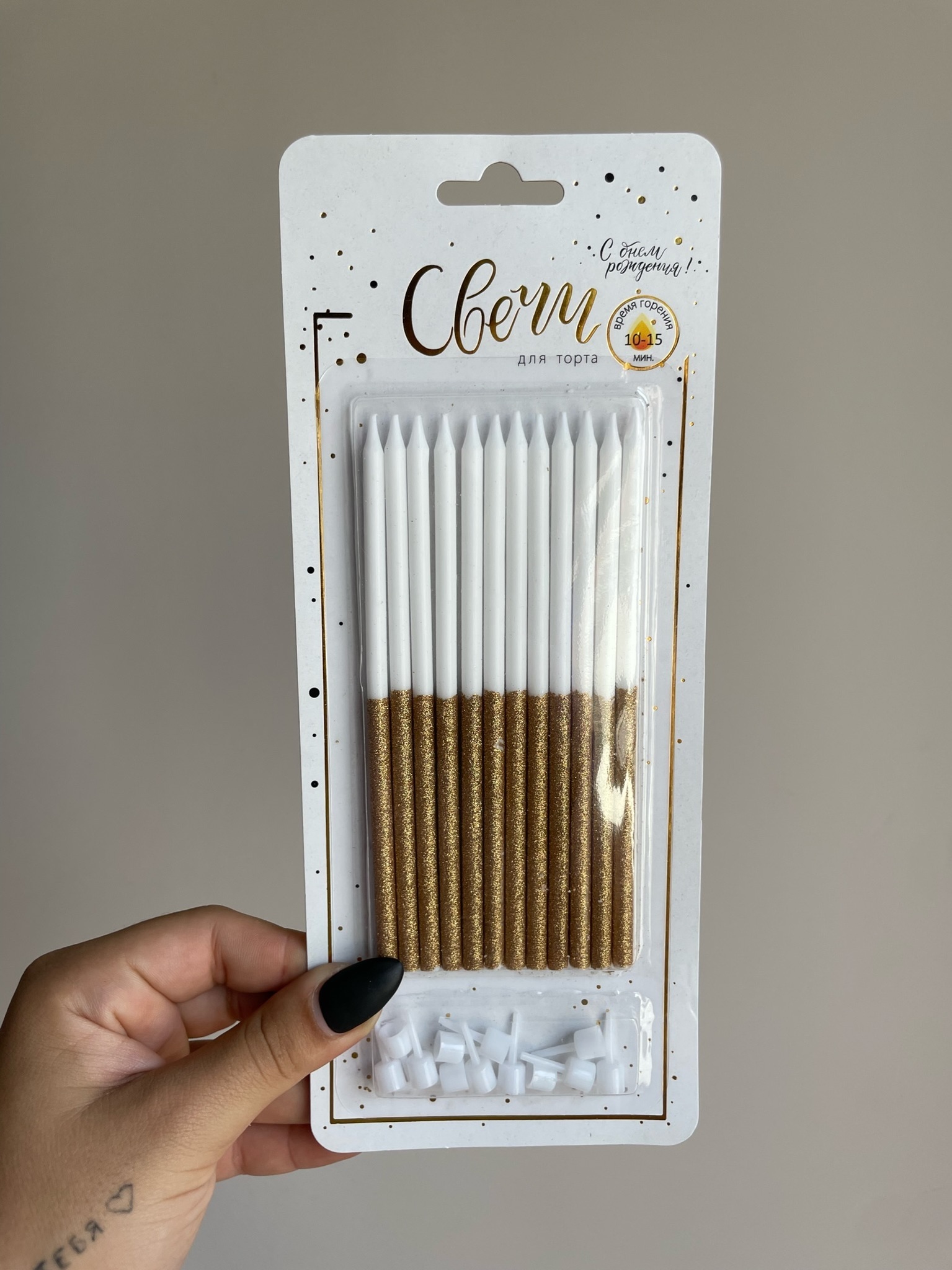 Свечи тортовые классические XL Половинки с золотым глиттером с держателями, 12 шт 15 см