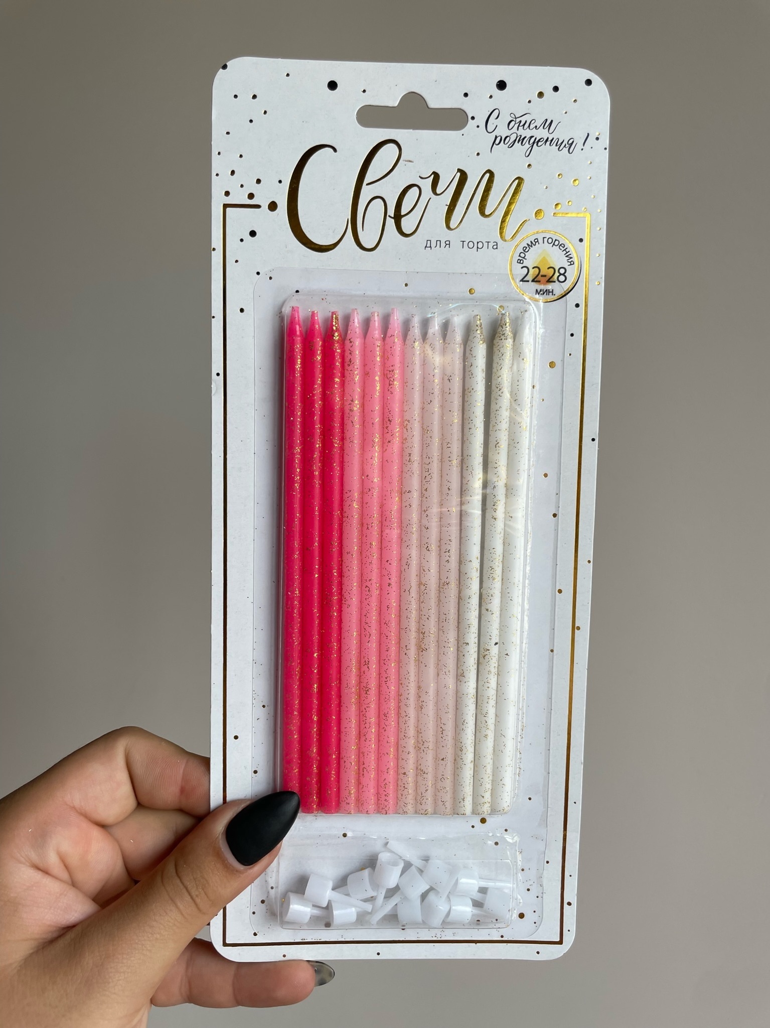 Свечи тортовые классические XL"Микс с глиттером" Розовый, нежно-розовый, персиковый с держателями 15 см, 12 шт.